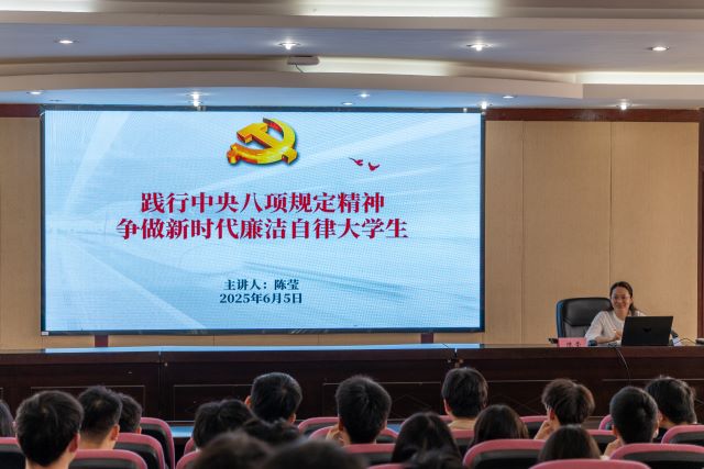 活动伊始,党委副书记陈莹老师以《践行中央八项规定精神,争做新时代廉洁自律大学生党员》为题,深入解读中央八项规定精神的深刻内涵与时代要求,强调了廉洁自律对于即将步入社会的毕业生党员的重要性。陈老师寄语毕业生党员,要始终将纪律规矩挺在前面,将廉洁要求内化于心、外化于行,在未来的人生道路上,无论身处何地、何种岗位,都要以坚定的政治立场和过硬的专业素养,为国家发展和社会进步贡献智慧和力量。