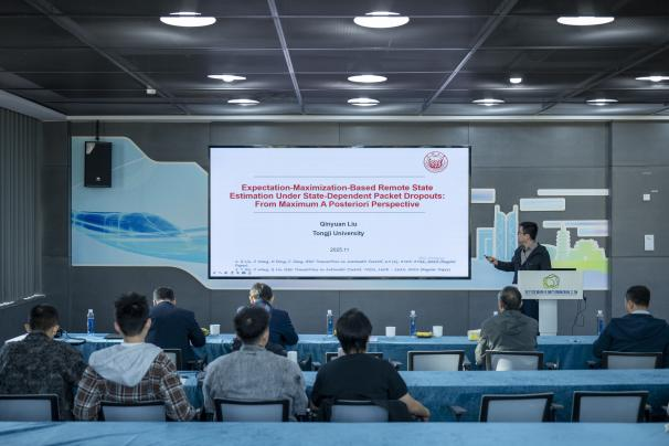 东华大学沈波教授分享了在状态饱和滤波方面的最新研究成果,针对复杂网络中存在的数据饱和、通信协议与网络攻击等问题,提出了多种滤波设计方法,保障系统在复杂环境下的稳定运行。同济大学刘钦源博士研讨了针对状态依赖数据包丢失场景的远程状态估计方法,从最大后验概率视角出发,提出了基于期望最大化框架的批处理与迭代滤波算法,揭示了传统滤波方法与现代机器学习技术间的理论联系,并建立了后验克拉美-罗下界为算法性能提供了评估基准。